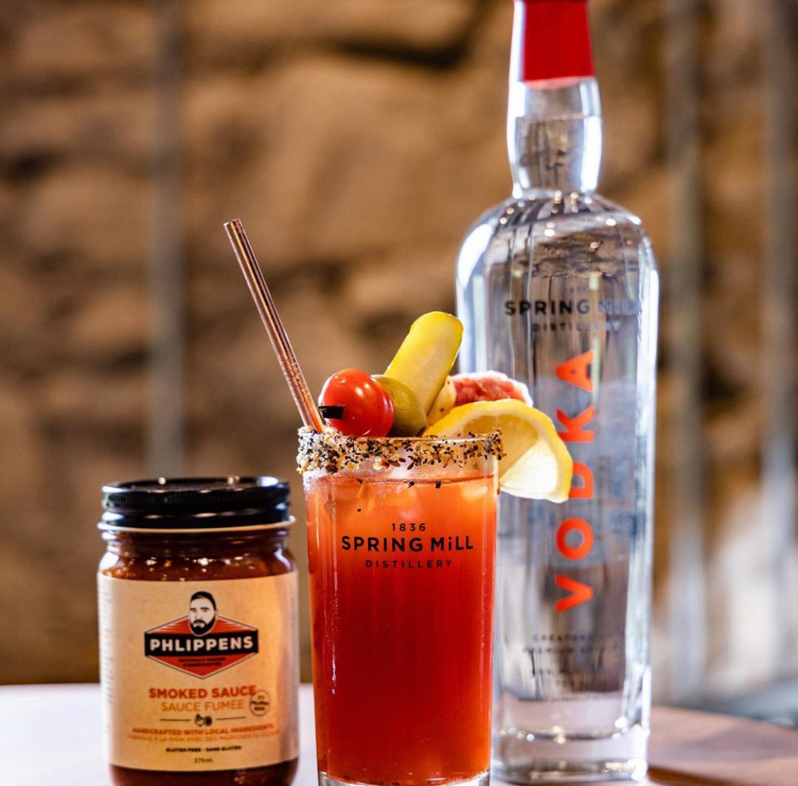 Spring Mill Distillery featured mini Phlippens jars as bottle hangers on their vodka and gin bottles, complete with custom Caesar recipes. This innovative partnership brought our smoked sauce directly to spirit enthusiasts looking to craft the perfect cocktail at home.